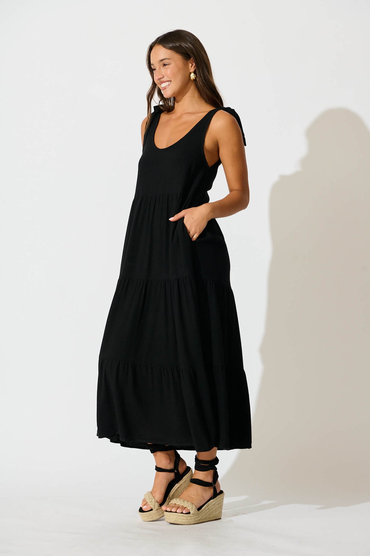 Our Estefani Maxi Sundress is comfortable, simple and fashionable! Features a adjustable tie shoulder, twin side pockets and tiered skirting. Pair with a cute pair of heel sandals, gold accessories and a cute clutch bag.