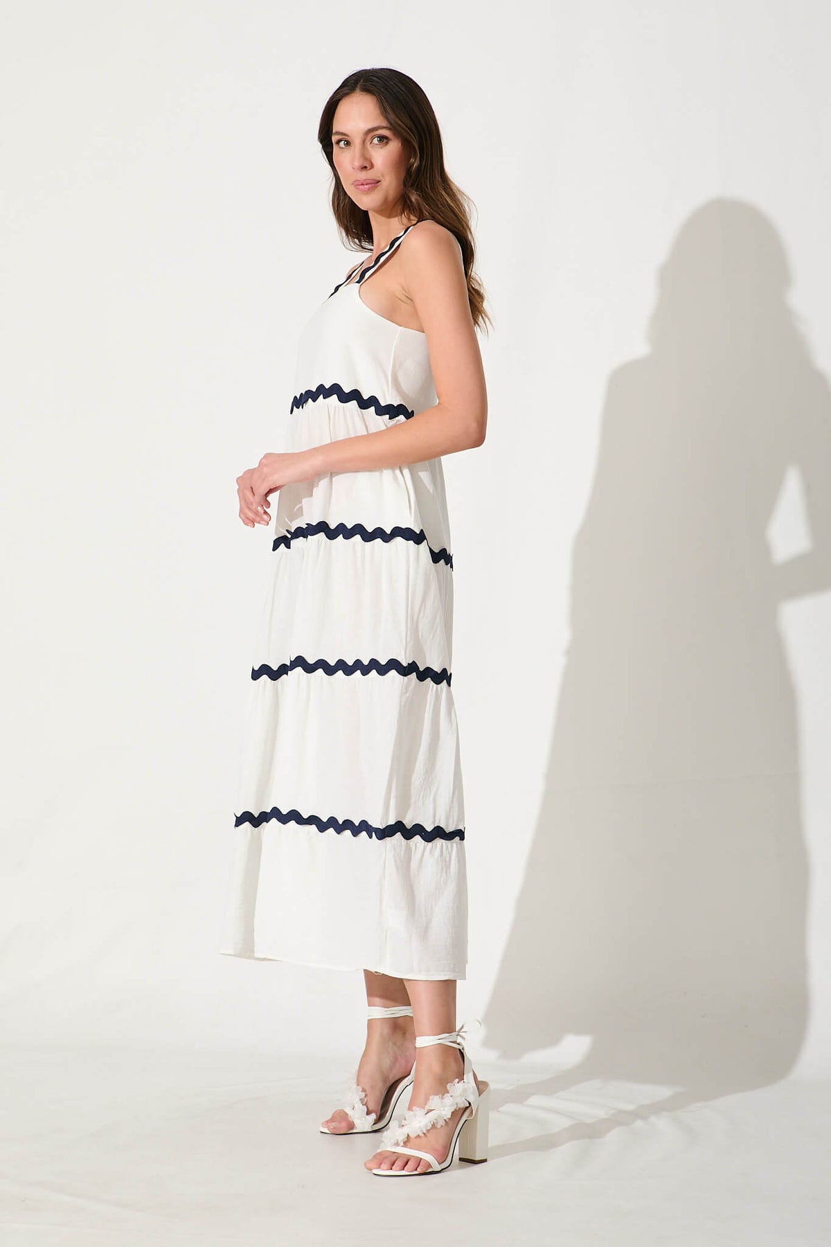 Hara Maxi Sundress In White With Navy Ric Rac Trim Cotton
