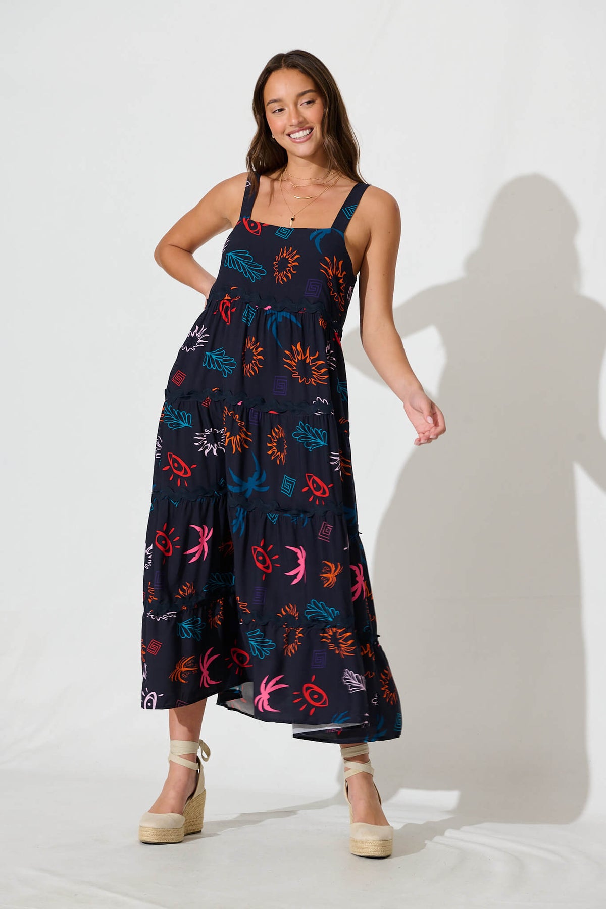 Jolie Maxi Sundress in Navy Print With Black Ric Rac Trim